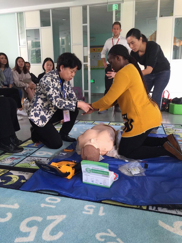 应学校邀请,浦东新区红十字资深救护师资刘和芳为幼儿园外教老师和中文老师开展心肺复苏、气道异物梗阻及AED使用急救培训。