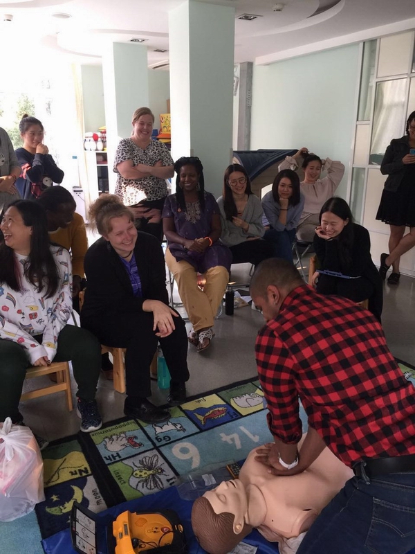 救护师资一一给予他们解答。为了更好的让外教们在短时间内掌握急救知识,师资尽己所能,通过表情、肢体语言等多种方式,将知识传授给他们。
