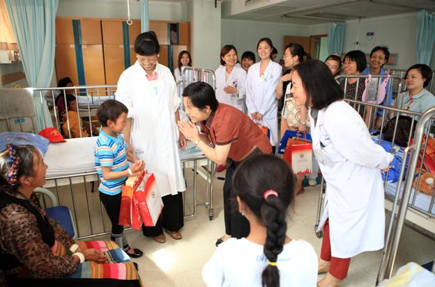 中秋节前一天,市红十字会副会长孙大红一行专程赴医院了解12位西藏患儿的医治情况。在季庆英副院长的陪同下,孙大红进入病房看望慰问住院治疗的患儿和随队医生,为他们送去学习文具、月饼和大白兔奶糖等上海特产,鼓励小患者们好好休养,争取早日康复,并祝他们在上海度过一个快乐的中秋节。