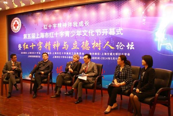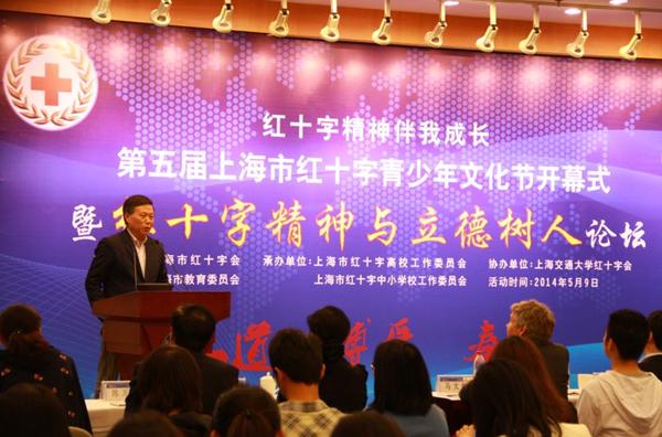 5月9日,由上海市红十字会、上海市教育委员会共同主办,上海交通大学红十字会承办的“红十字精神伴我成长”第五届上海市红十字青少年文化节开幕式暨“红十字精神与立德树人”论坛在上海交通大学隆重举行。上海市红十字会常务副会长马强,上海市红十字会副会长李明磊,上海交通大学副校长、校红十字会会长张安胜,红十字国际委员会东亚地区代表处主任高兰博,上海社会科学院社会学研究所所长、青少年研究所所长杨雄,上海市中小学德育研究协会副秘书长何康等领导和嘉宾出席论坛。市教育委员会红十字工作分管干部、各区(县)红十字会青少年工作分管会长和干部、区(县)教育局红十字与德育工作分管干部以及各高校红十字会秘书长、学生分会骨干、志愿者代表和各中小学校红十字会会长、秘书长代表等200余人观摩论坛。