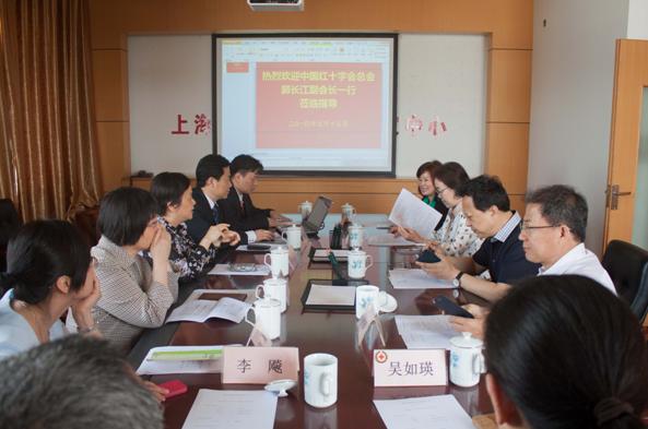 2014年5月15日,中国红十字会总会副会长郭长江、中国红十字会总会报刊社社长兼总编辑吴苾雯、副总编辑吕进福一行到上海市红十字备灾救灾中心(以下简称“中心”)检查指导工作,上海市红十字会副会长孙大红、赈济救护部部长滕桂香陪同。