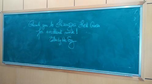 Elhadj Amaduo G Sy、Jagan Chapagain、赵白鸽充分肯定了上海的红十字工作。赵白鸽希望上海不仅要将好的做法和经验向全国推广,还要进一步加强国际交流。红十字会与红新月会国际联合会秘书长Elhadj Amaduo G Sy在视察“中心”计算机教室时,欣然在黑板上写上了“Thank you to Shanghai Red Cross for excellent work!”(感谢上海市红十字会的出色工作!)(见下图)