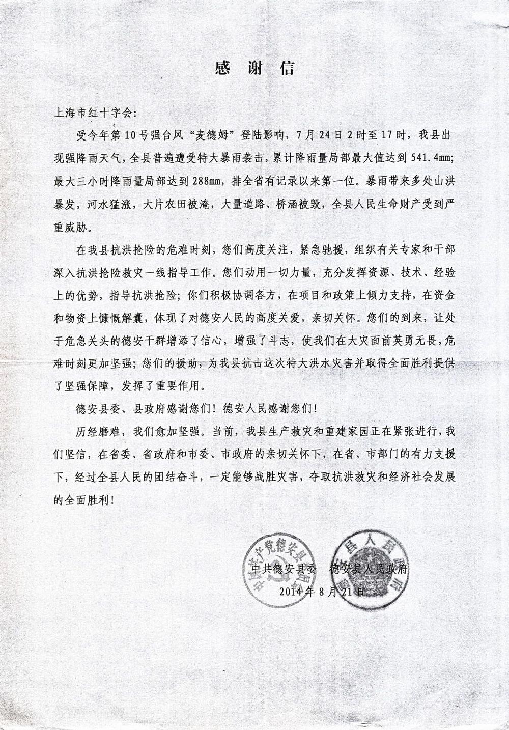 德安县是接受捐助的受灾县之一,最近,该县向上海市红十字会发来感谢信,感谢上海市红十字会在危难时刻发挥一方有难八方支援的精神,支援了家庭救助包,发挥了重要的作用。
