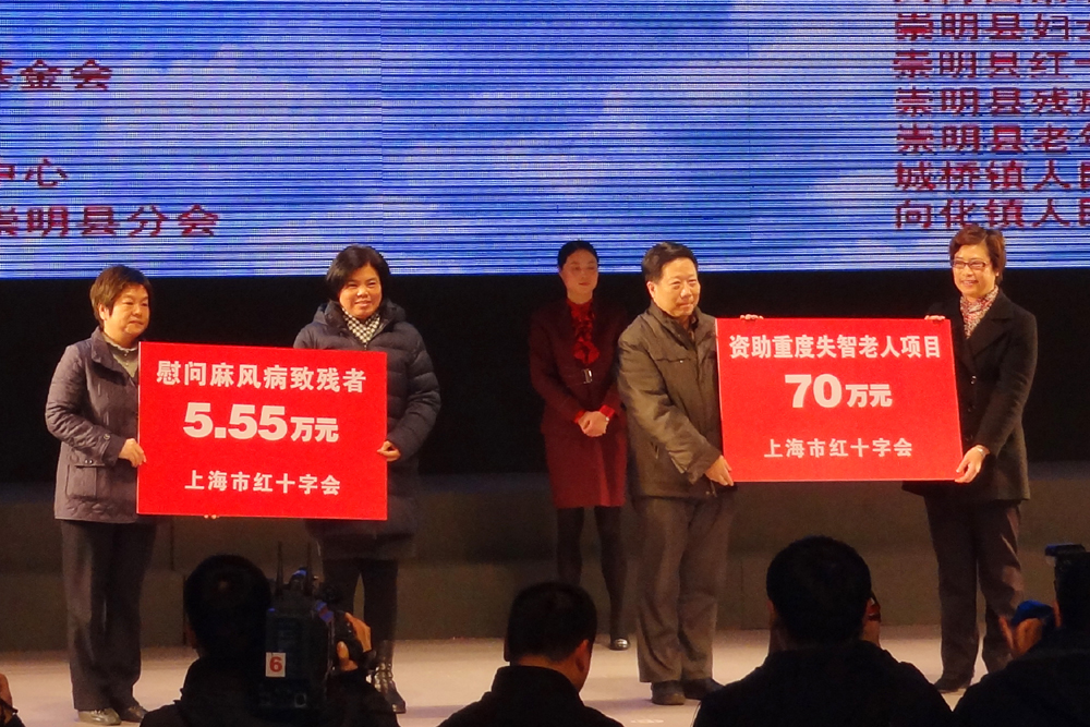 市红十字会党组书记高解春、副会长孙大红向崇明重度失智困难老人赠送70万元护理用品费和5.55万元麻风病致残者慰问金,崇明县红十字会常务副会长顾钱菊、秘书长黄萍接受捐赠。