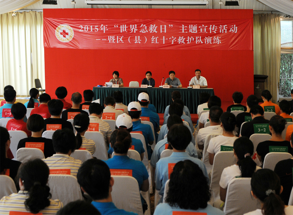 为进一步普及和提高现场初级急救知识与技能,提高各区县红十字救护队的综合能力,9月18日上午,市红会在东方绿舟——上海市红十字青少年现场初级急救培训基地,举行2015年世界急救日主题宣传活动暨区(县)红十字救护队演练,本市17个区(县)的红十字救护队参加。市红十字会常务副会长高解春、副会长孙大红和市红十字青少年现场初级急救东方绿舟培训基地副主任吉峰出席。市红会赈济救护部滕桂香部长主持。