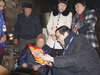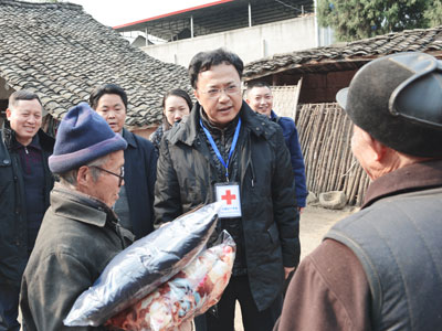 1月26日,郭长江一行来到四川省德阳市中江县,入户慰问困难群众。在通济镇苕坡村,郭长江走进4个困难户家中,为他们送去大米、棉衣等生活必需品和慰问金,叮嘱他们添置一些物品,过个好年。83岁的五保户杨天财老人是一位聋哑症患者,生活非常困难。郭长江为他送上慰问物资和慰问金,叮嘱当地村干部和红十字会要多关心老人,及时为他解决生活困难。