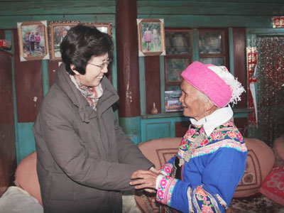 1月21日,郝林娜一行来到陕西省商洛市山阳县十里铺村,慰问当地10户困难家庭。在97岁独居老人孙富菊家中,老人热泪盈眶拉着郝林娜的手,连声道谢。郝林娜说:“看到山区群众的生活如此困难,我的心情很沉重,说明我们的任务还很重,还必须克服困难,继续努力。”