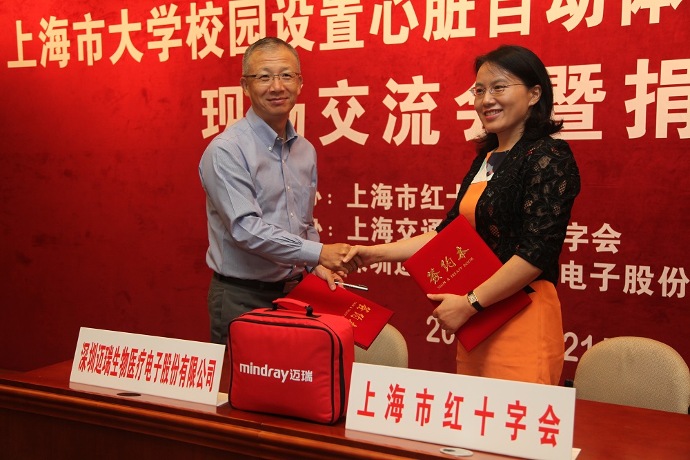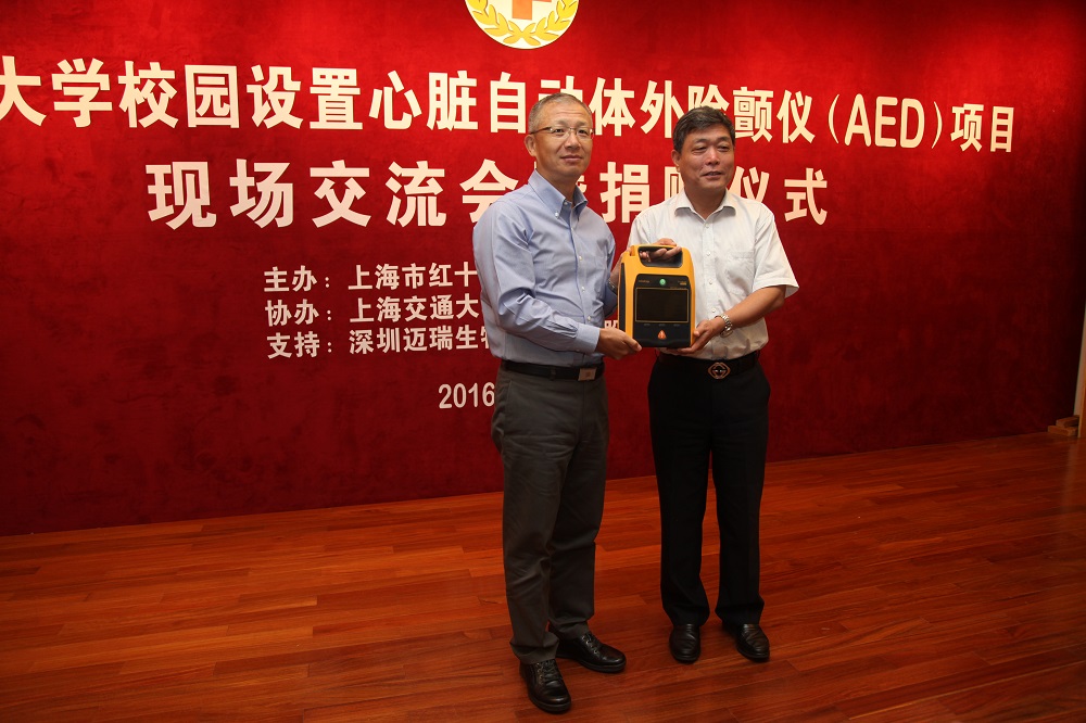会议旨在加大AED项目的校园宣传和技能普及,促进AED在大学校园的设置和使用。国内首个大规模设置AED的高校——上海交通大学红十字会在会上介绍了校园设置心脏自动体外除颤仪(AED)项目的布点、安装和人员培训情况。深圳迈瑞生物医疗电子股份有限公司在捐赠仪式上向上海市红十字会捐赠56台、总价值 30.8万元的AED训练机,用于支持上海市红十字会在高校进一步开展现场初级救护培训及心脏自动体外除颤仪(AED)的培训工作。