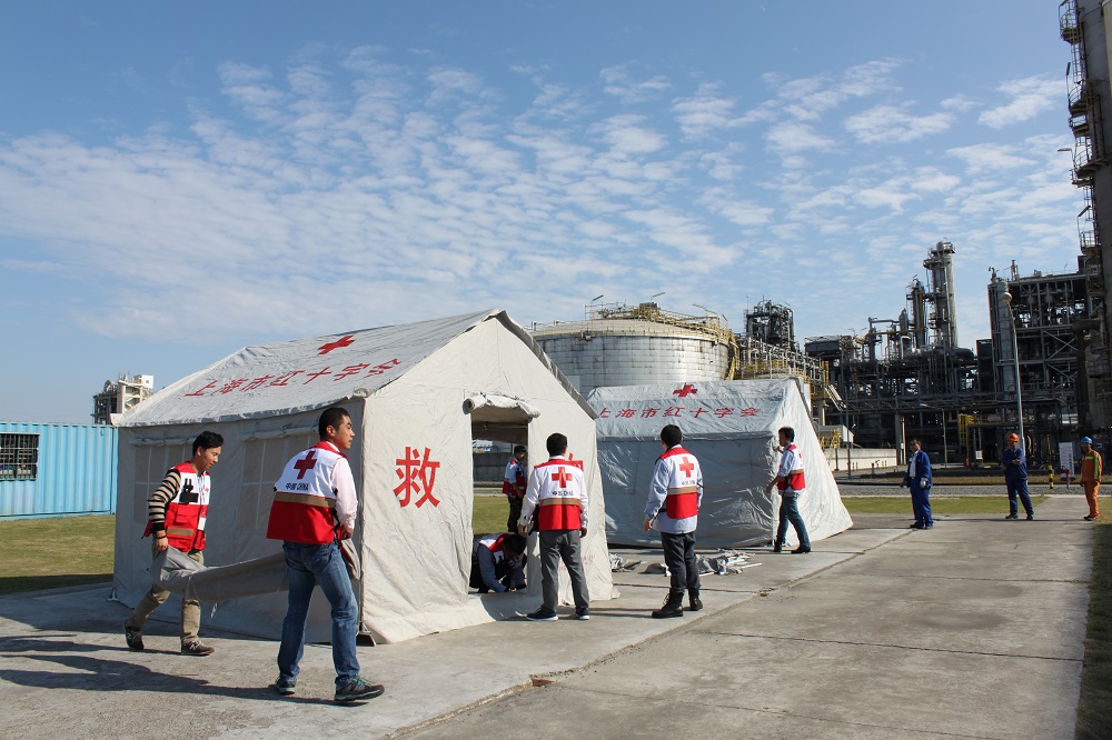 10月25-27日,上海市红十字应急救援队在上海化学工业区开展以化学品泄漏危机处理为背景的培训演练活动。此次活动得到中国红十字会总会、红十字国际委员会、上海市应急办和上海化学工业区管委会的大力支持。来自市民政局、市民防办、江苏省、浙江省红十字会的相关工作负责人以及各区红十字会分管领导、专职工作人员、红十字应急救援队队员70余人参加了此次活动。市红十字会常务副会长张浩亮、化学工业区管委会副主任余亮茹、中国红十字会总会赈济救护部灾害管理处处长吴宏军出席活动开班式并讲话。