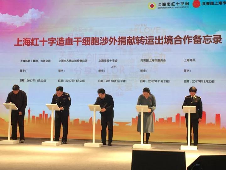 11月23日下午,上海市红十字会、共青团上海市委员会、上海出入境边防检查总站、上海海关、上海机场(集团)有限公司在青年干部管理学院青年会堂,联合举办“为了生命的希望工程——2017年上海青年造血干细胞捐献集中行动暨上海市红十字造血干细胞捐献宣传表彰”活动,并签署合作备忘录,共同建立上海造血干细胞跨国转运绿色通道。