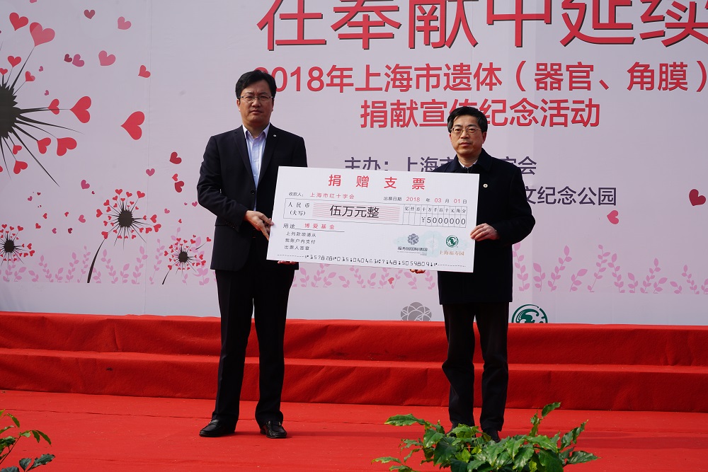 上海市红十字会党组书记、常务副会长张浩亮(右)接受上海福寿园5万元捐赠作为“走进捐献者——博爱基金”