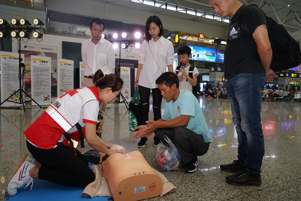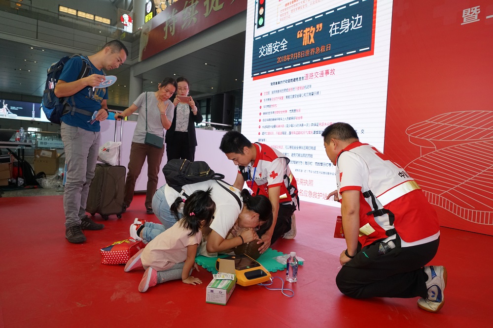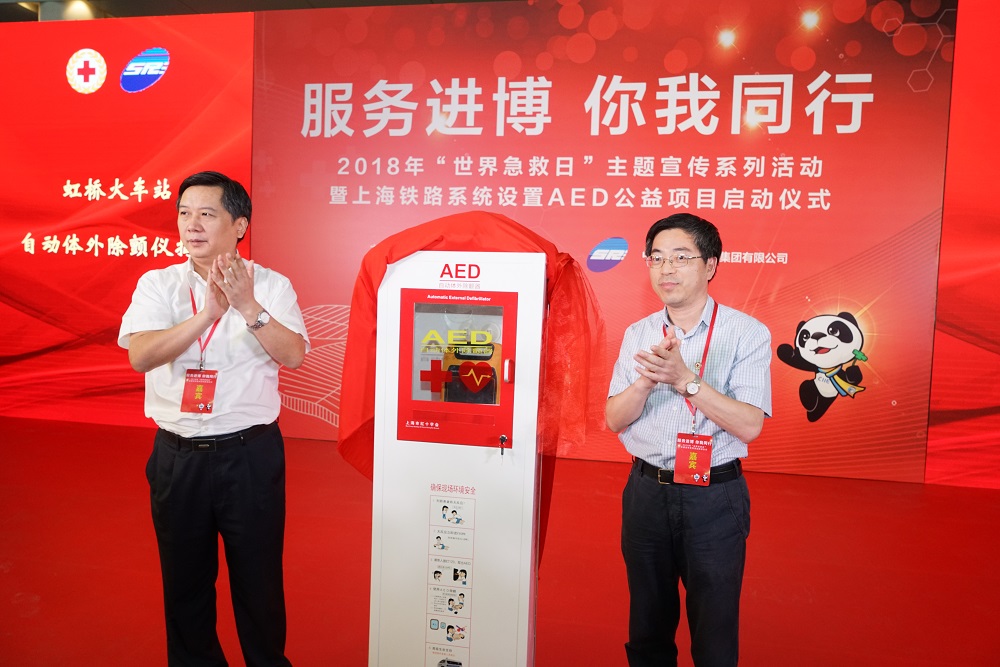 2018年9月8日是第19个“世界急救日”,恰逢首届国际进口博览会倒计时57天,上海市红十字会和中国铁路上海局集团有限公司在上海虹桥火车站候车厅共同举办“服务进博,你我同行”——世界急救日主题宣传活动暨上海铁路系统设置AED公益项目启动仪式。市应急办、市精神文明办、市卫计委、市交通委、进博局、虹桥商务区管委会、团市委等单位领导及各区红十字会主要领导、企业代表、媒体、红十字志愿者等近百人参加了此次活动。